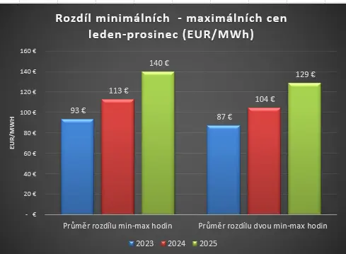 Po relativně stabilním období let 2023–2024 se rok 2025 vyznačoval výrazným nárůstem cenových výkyvů. Průměrný denní rozptyl cen (rozdíl mezi denním minimem a maximem) vzrostl z cca 93 EUR v roce 2023 na 140 EUR v roce 2025. Což je 50 % nárůst! Na trhu se začaly běžně objevovat extrémy – od minimálních cen kolem –224 EUR/MWh až po špičky dosahující 563 EUR/MWh