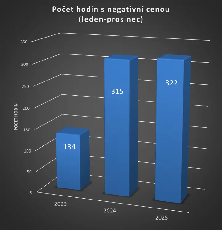 Klíčovým trendem roku 2025 byl rekordní počet hodin se zápornou cenou. Podle statistik bylo v roce 2025 zaznamenáno 322 hodin se zápornou cenou, což je výrazný nárůst oproti 134 hodinám v roce 2023. Tento jev je způsoben nadvýrobou z obnovitelných zdrojů (OZE), zejména fotovoltaiky kolem poledne, což vytváří tzv. „duck curve“ efekt – ceny jsou nejnižší uprostřed dne a prudce rostou během večerní špičky. Průměrná roční cena se přitom pohybovala kolem 97 EUR/MWh.
