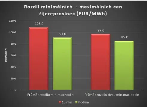 Průměrný denní rozptyl cen (rozdíl mezi denním minimem a maximem v hodinovém ekvivalentu) dosahuje u 15minutových intervalů 108 EUR/MWh, což je o 17 EUR/MWh více než u hodinových intervalů (91 EUR/MWh).