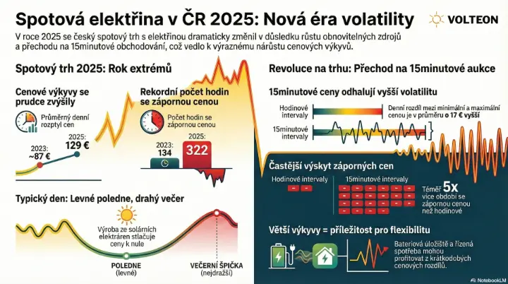 Rok 2025 se do historie české energetiky zapíše jako rok návratu vysoké volatility a zásadních technologických změn. Pro firmy, které nakupují elektřinu na spotovém trhu, přinesl tento rok nové výzvy, ale především obrovské příležitosti pro ty, kteří dokáží svou spotřebu flexibilně řídit. Ve Volteonu pomáháme klientům tyto příležitosti těžit skrze chytré řízení a akumulaci, což je v dnešním dynamickém prostředí důležitější než kdy dříve.