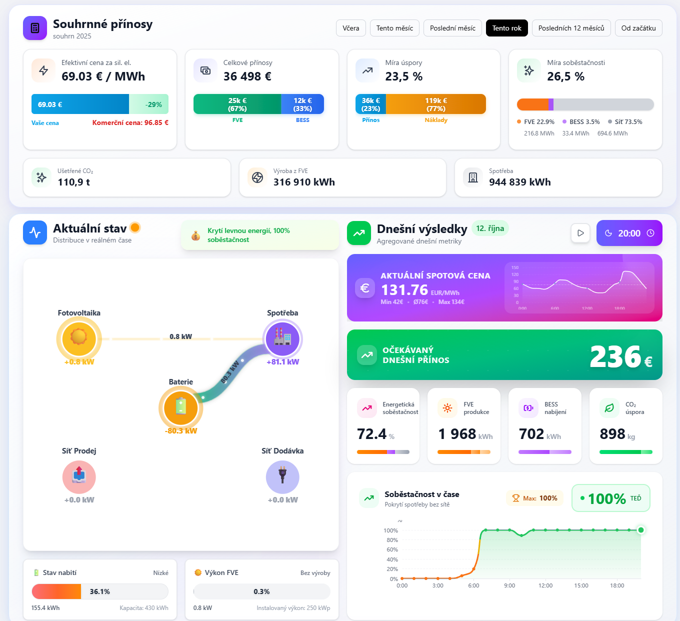 Úspora závisí na velikosti vaší FVE, kapacitě BESS a vaší spotřebě. Naši klienti běžně dosahují snížení nákladů na elektřinu o 15–40 %. Díky AI predikcím optimalizujeme nákupy energie ze sítě a maximalizujeme využití vlastní vyrobené elektřiny, což přináší nejvyšší ekonomický efekt.