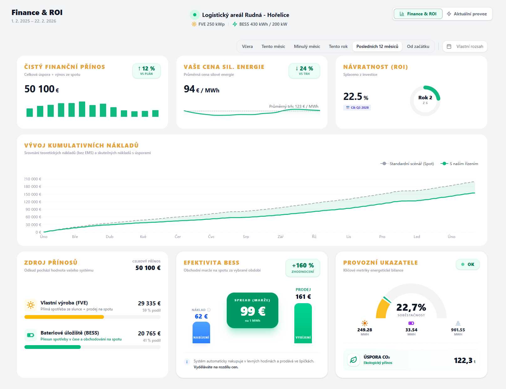 - Roční úspory na silové elektřině (před/po zavedení BESS)